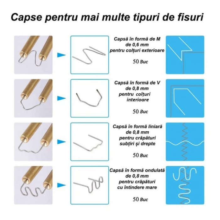 Cu ajutorul setului format din pistol si capse pentru lipit plastic vei putea sa economisesti timp si bani. Sistemul sau iti va permite repararea solida a pieselor din plastic deteriorate. Cu doar cateva capse fierbinti, vei economisi sute de lei si timp. Setul se va plati singur doar cu o singura utilizare.
